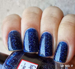 I've also become obsessed with finding a dupe for Essie's Starry Starry Night, a color from a few years back. This is certainly not a dupe here, but it might fulfill my need for a dark blue nail polish that glints like the night sky. Starry Starry Night is a black-blue, while this blue is closer to a royal.